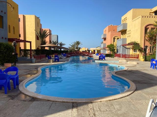 Volledig gemeubileerd 1-slaapkamer appartement voor langdurige huur in Makadi Heights Phase 2, Hurghada. 58 m² + 37 m² privé dakterras met panoramisch zeezicht.