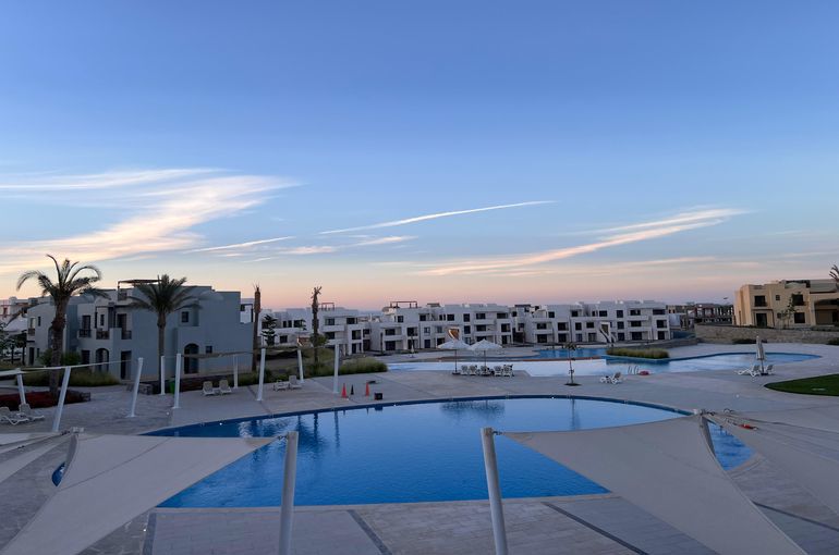 Ruim 106,5 m² appartement voor langdurige huur in Makadi Heights Phase 2 met 3 slaapkamers, 2 master suites, 2 balkons, groot terras met jacuzzi, zee- en lagunezicht en directe toegang tot het zwembad